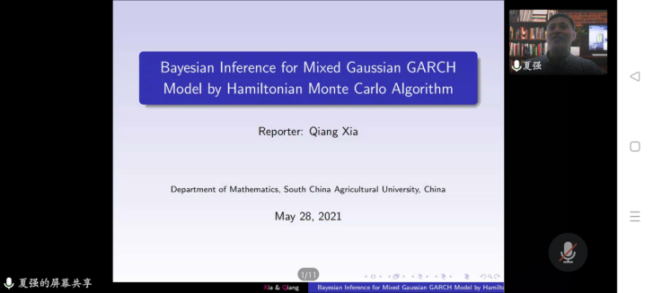 报告会中,华南农业大学夏强教授首先讲解了一种易于执行且能有效地从后验分布中提取样本的哈密顿蒙特卡罗(Hamiltonian Monte Carlo, HMC)算法来估计高斯混合GARCH模型。然后,在贝叶斯估计的基础上,研究了高斯混合GARCH模型的预测方法。通过仿真实验,HMC算法比Griddy-Gibbs采样器更快、更灵活。最后给出了一个实际应用讲解,验证了该算法的有效性。使大家对于HMC算法的高效性有了更加深入的了解和兴趣。