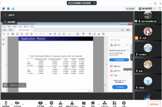 报告中,童行伟教授通过现实中的实际例子,例如注射新冠疫苗和打太极的产生的效果等,生动形象地向我们讲解了因果推断的相关概念与研究内容。童行伟教授还介绍了一种基于倾向得分的使用B样条的新半参数估计策略,该策略不依赖于参数模型规范。通过解决误差异方差性进一步提高了估计器的效率,还建立了两个估计量的渐近性质。模拟研究表明,该方法与许多竞争估计器相比具有优势且优于加权估计器,因为它不受极端权重的影响。该方法应用于2012年俄亥俄州医疗补助评估调查(OMAS)的数据,估计了医疗保险对根据“平价医疗法案”选择补贴保险计划的人群自我报告的健康状况的影响。
