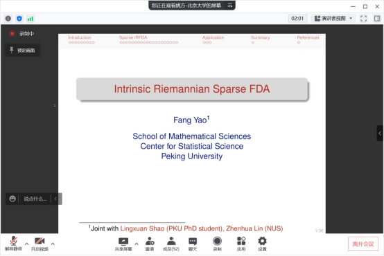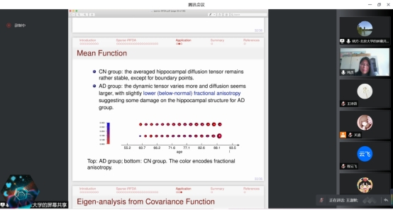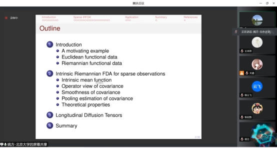 报告中,姚方教授从A motivating example ,Euclidean functional data和Riemannian functional data出发,提出了一种新的分析稀疏黎曼函数观测值的数据框架。借助数据,从协方差算子视图,协方差光滑性,协方差池估计,理论性质四个方向出发,介绍了四个的组成部分:独立的协方差函数,一个光滑向量丛称为协方差向量丛,一个平行传输和一个关于协方差矢量丛的光滑丛度量。讲解方式深入浅出,不仅让师生收获颇多,也激发了同学们对此研究方向浓厚的学习兴趣。