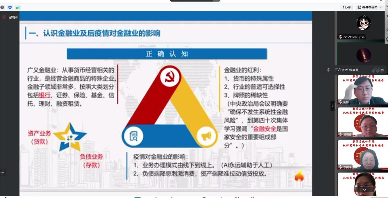 (通讯员:杨凯)2022年12月1日下午14:00,我院邀请中国建设银行锦州城南支行徐嘉蕾行长做题为《后疫情时代金融方向的就业选择》的报告,本次报告由学院统计系主任杨凯主持,学院副院长李纯净、统计系支部书记袁晓惠,以及统计系胡茜等青年教师以及2020级、2019级本科生以及研究生参加了本次线上报告。