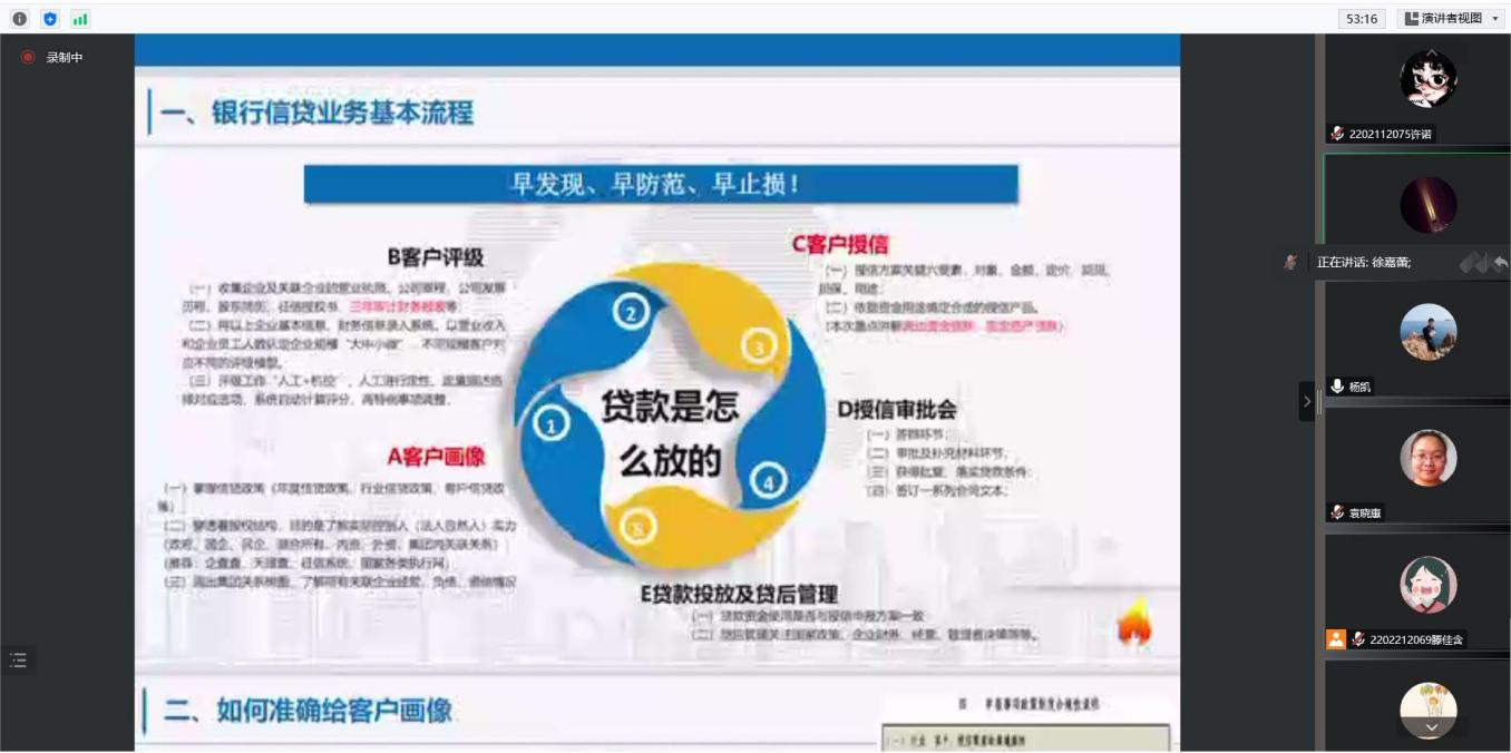 徐嘉蕾行长还介绍了在金融领域工作需要必备的知识技能,并结合同学们的专业特点,着重讲了在业务核心技能方面该如何应用到自己的专业本领,其详细介绍了有关信贷业务方面的“三张表”:资产负债表、利润表以及现金流量表,如何通过报表了解贷款方的资产、盈利以及现金支付能力情况,从而通过计算给出合理的贷款金额。