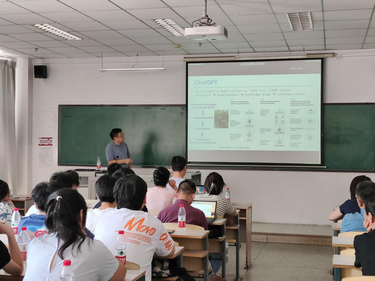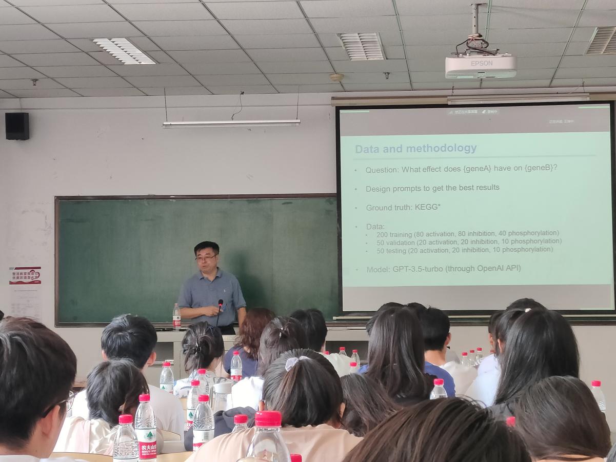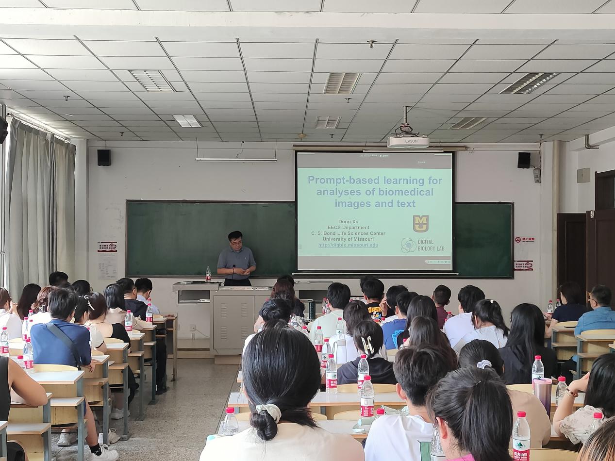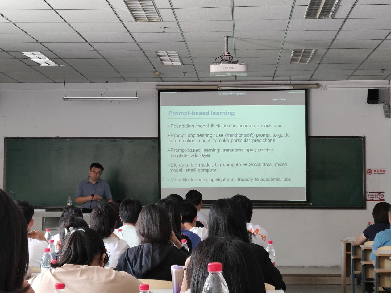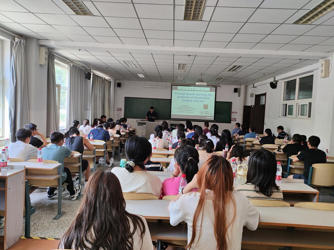 此次学术报告中,旭东教授分别从研究背景、基础模型时代、基于项目的学习、未来工作等方面向同学们讲解有关基于即时学习的生物医学图像和文本分析的相关知识。首先许东教授向同学们介绍了基础模型时代,接着又向同学们介绍了机器学习模式等知识,对于难以理解的知识,许东教授会用同学们熟悉的实例来解释。理论联系实际,让枯燥的知识变得生动起来,同学们理解起来也不再困难。最后许东教授向我们介绍了其团队未来的工作方向和发展趋势。报告结束后,部分同学向许东教授提出了自己不懂的地方,许东教授都一一详细且耐心的给出了答案。