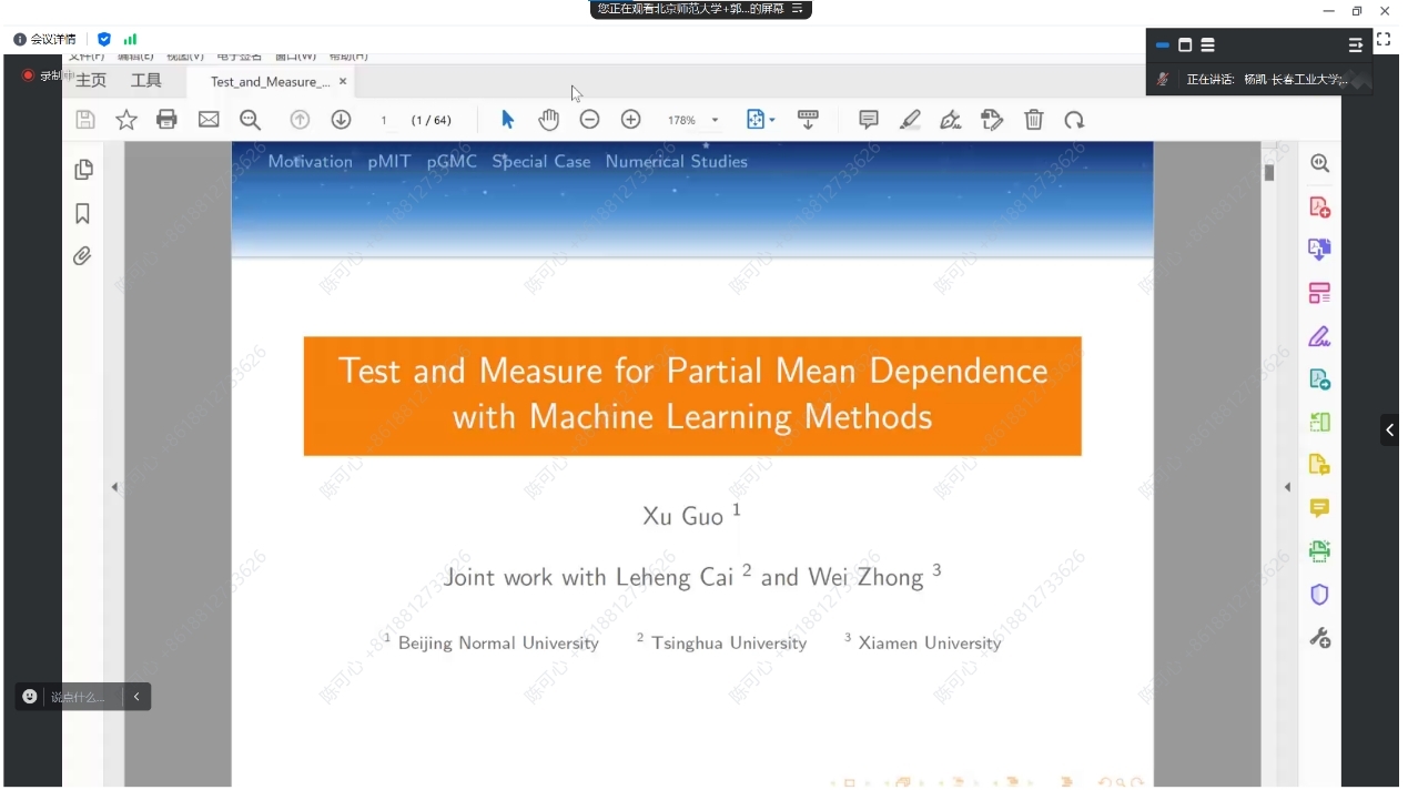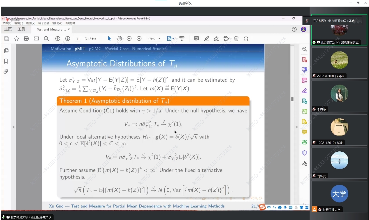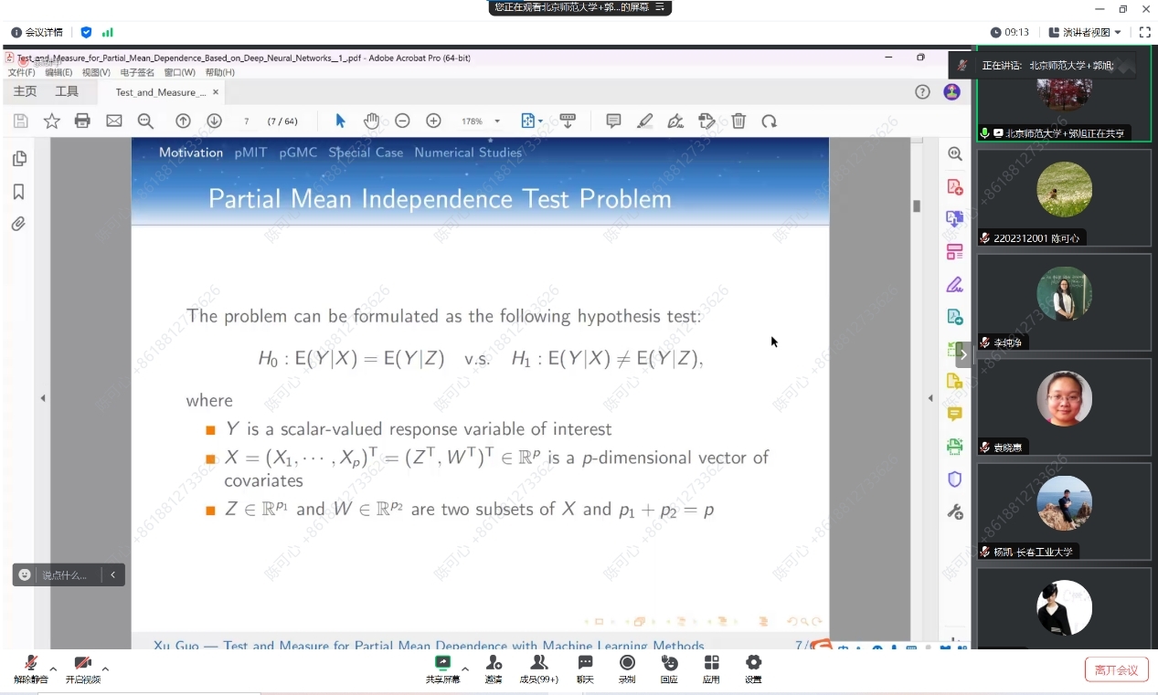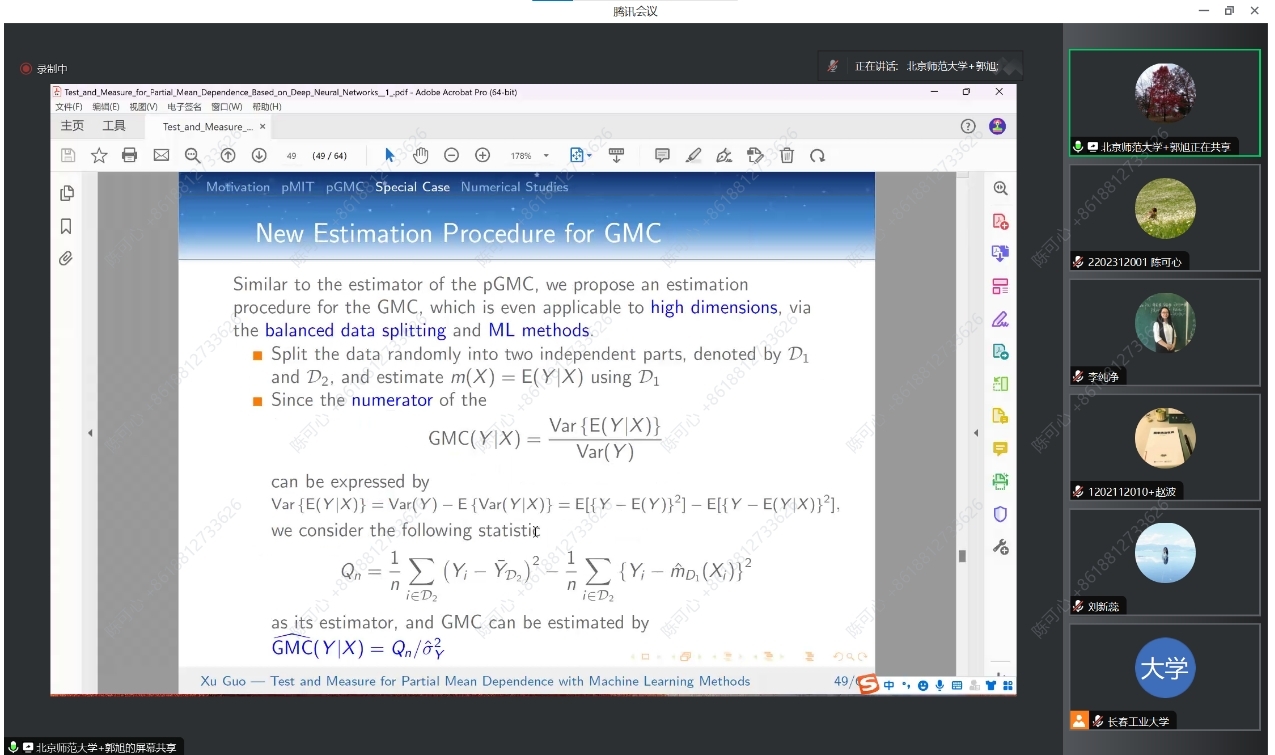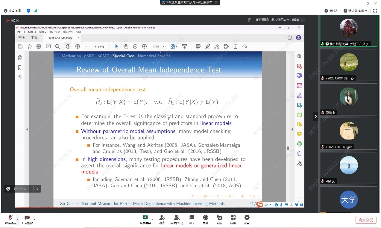 此外,报告还讨论了功率增强和算法稳定性问题。如果拒绝了零假设,报告提出了部分广义相关测量(pGMC),在控制了Z的非线性影响后,测量给定W的Y的部分均值依赖性。提出了 pGMC 的吸引人的理论特性,并建立了其估计值的渐近正态性和最优 N 根收敛率。作为一种重要的特殊情况,当不存在条件协变量 Z 时,引入了一种新的检验方法,即在无模型环境中检验协变量对响应的总体显著性。郭老师团队还进行了数值研究和实际数据分析,以与现有方法进行比较,并证明所提出的程序的有效性和灵活性。