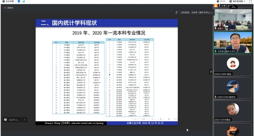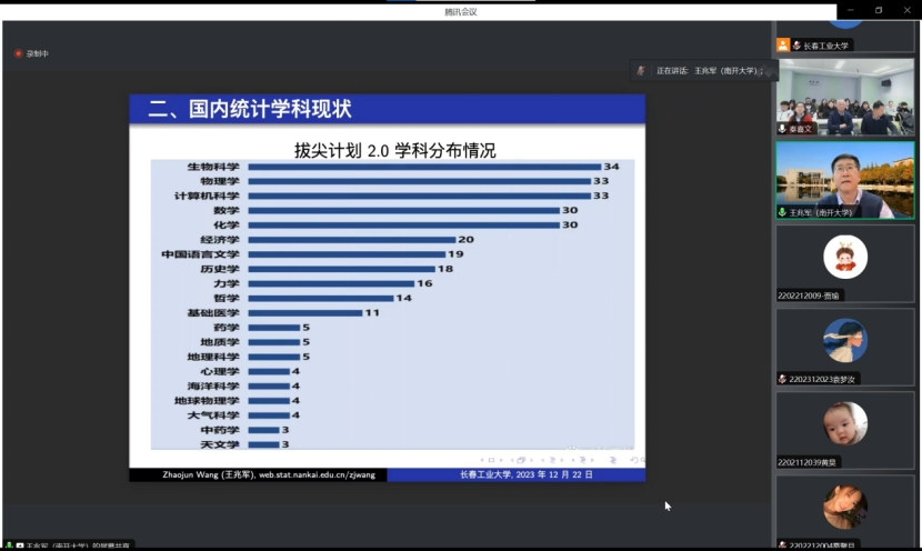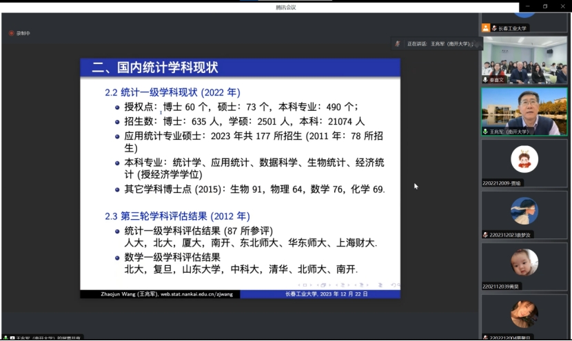 王兆军教授为我们介绍了国内统计学科现状,介绍了统计学在本科、硕士、博士的课程体系、研究方向、学生人数等情况,一流学科在各大高校的分布、本科专业情况,以及统计学界顶刊论文发表情况等。