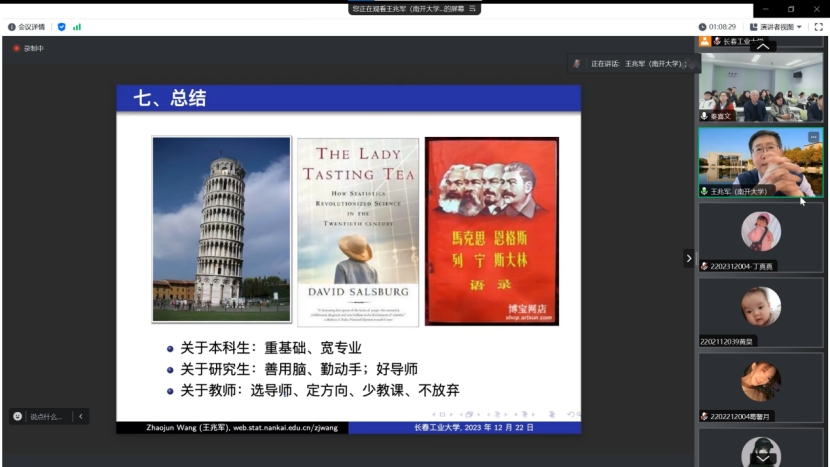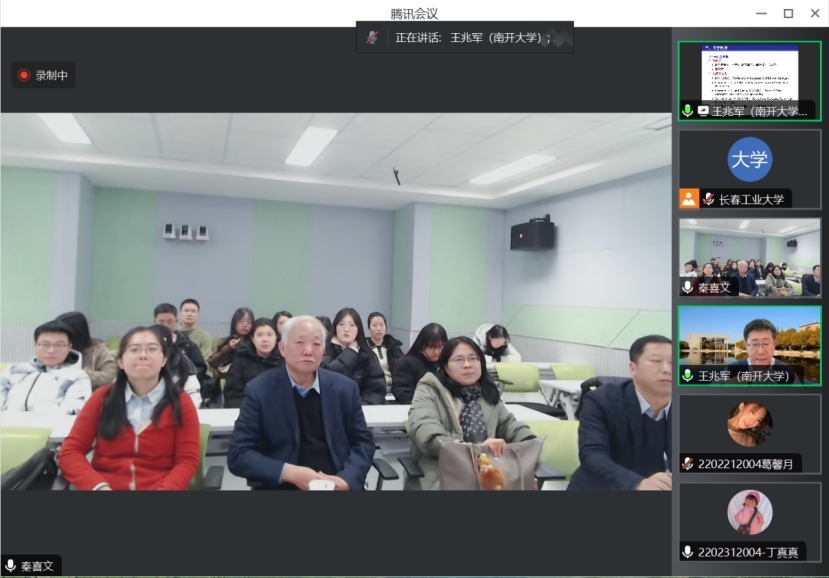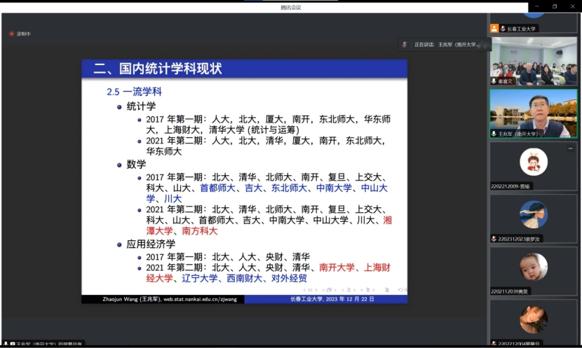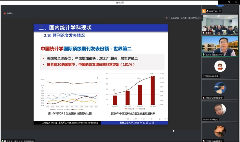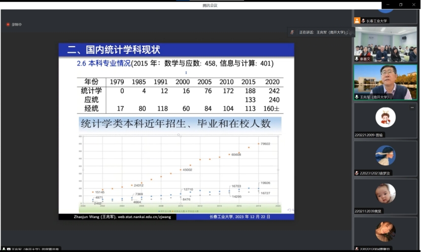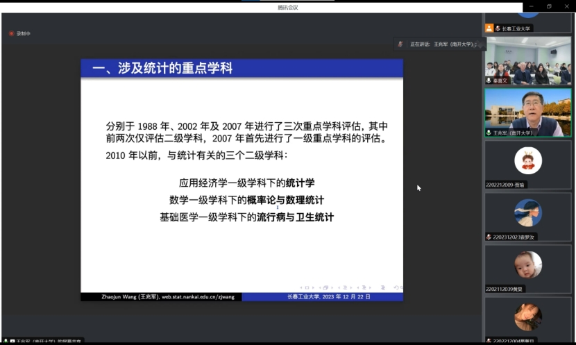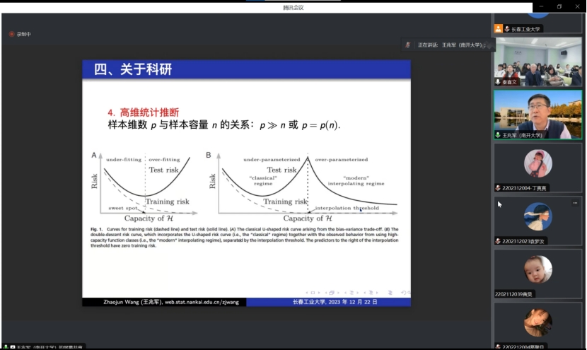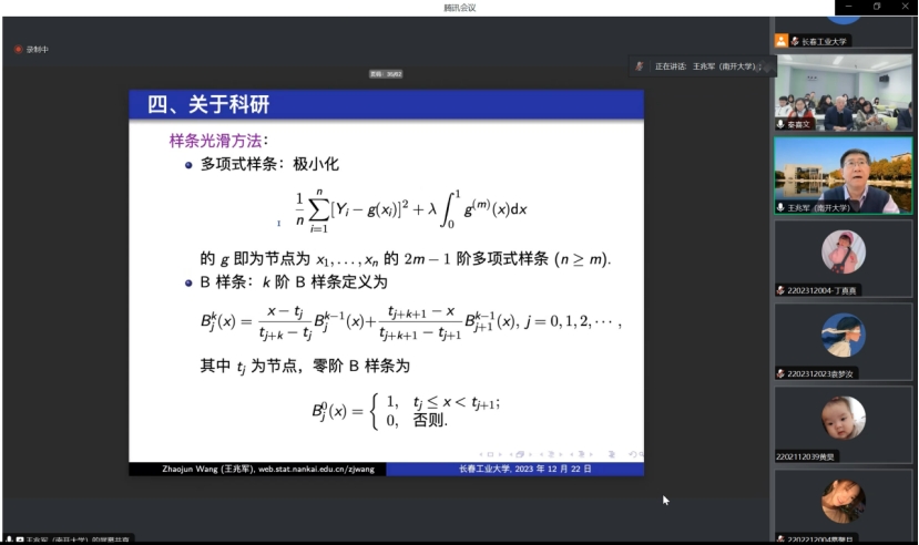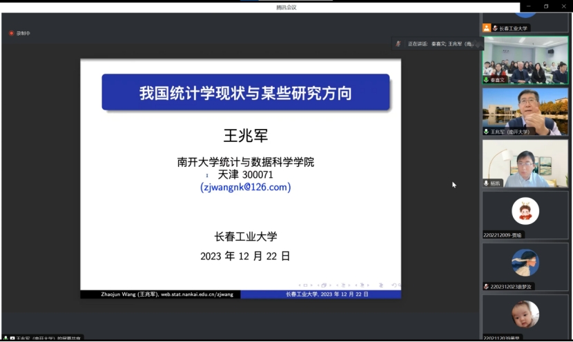 (通讯员:关迪)2023年12月22日9:00 ,南开大学王兆军教授为我院做线上学术报告,学校副校长林洁琼教授、校学术委员会副主任董小刚教授、MILE米乐官方网站院长王纯杰教授、MILE米乐官方网站副院长李纯净副教授、MILE米乐官方网站副院长杨凯副教授、MILE米乐官方网站统计系主任王淑影副教授以及学院部分老师、研究生参加了本次线上学术报告会。会议由大数据科学研究院院长兼学科建设办公室副主任秦喜文教授主持。