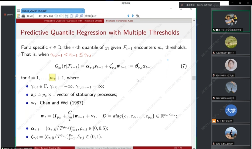 在接下来的讲解中,涂云东教授为我们介绍了分位数回归预测的性质,每个预测子的可预测性可以根据阈值变量的值从一种状态切换到另一种状态,并且可以在分位数之间变化,并且预测器可以具有不同程度的持久性。提出了一种与自适应群Lasso相结合的序列估计方法,以有效且一致地估计未知的多个阈值。为了消除序列估计中模型错误指定对阈值后续推断的影响,进一步考虑了阈值的分区估计。所得到的阈值估计量不渐近地依赖于来自其他状态的参数,并且具有对称的极限分布。最后采用自适应Lasso来识别每个方案中的重要预测因子,以提高每个分位数的预测精度。蒙特卡罗模拟证明了该方法在有限样本中的良好性能。对美国股票收益率的实证分析表明,收益率的可预测性随着经济政策不确定性的不同而变化。