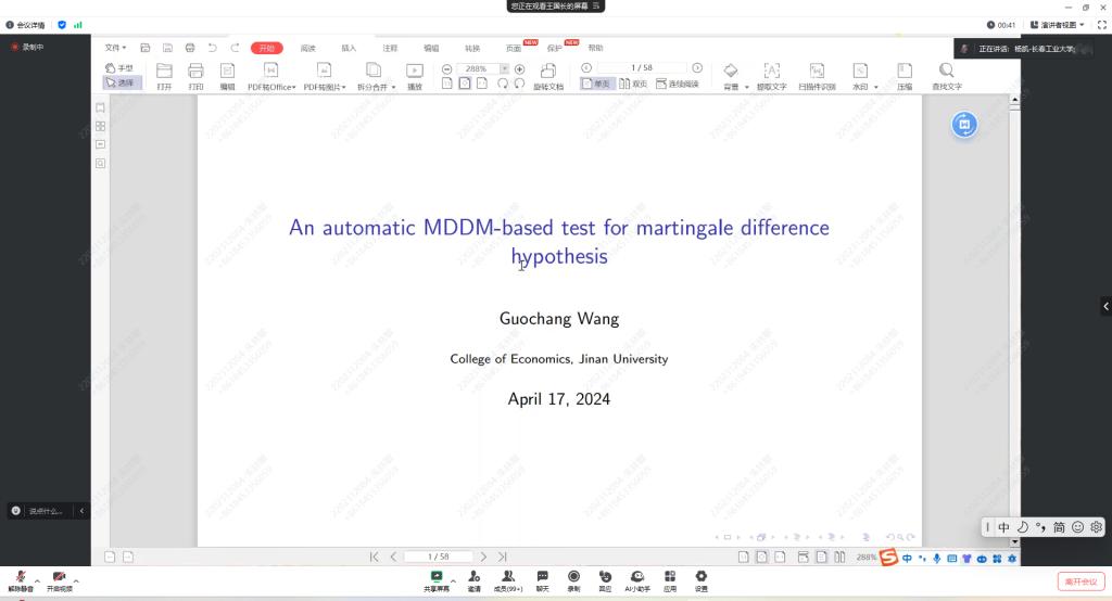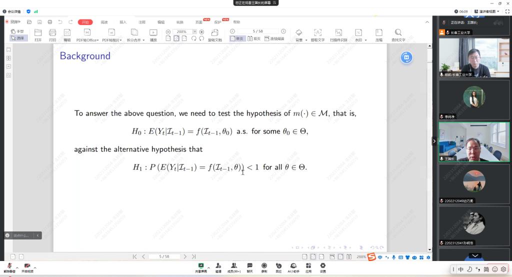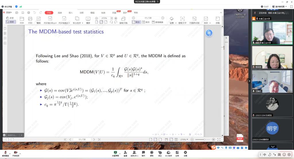 报告会中,王教授主要介绍了关于鞅差序列的检验问题。王教授主要侧重于在具有参数条件均值的多元时间序列模型中,关于检验误差项是否为边际差序列(MDS)的问题。基于MDDM的检验是检验多元时间序列模型中 MDS 的一种有效统计方法,但基于 MDDM 的检验应指定滞后期的数量。故为解决这个问题,有一种基于数据驱动的 MDDM 检验,可以自动选择滞后期。该检验有两个优点:首先,无需指定滞后期;其次,在零假设下滞后期等于 1,节省大量计算成本。