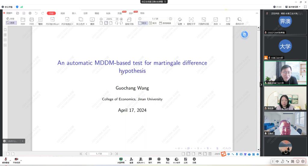 (通讯员:关迪)2024年04月17日(星期三)上午10:00,我院特邀暨南大学经济学院统计学系教授王国长教授做线上学术报告,报告由学院副院长杨凯副教授主持,学院副院长李纯净副教授、部分专任教师和全体研究生参加了本次学术报告会。