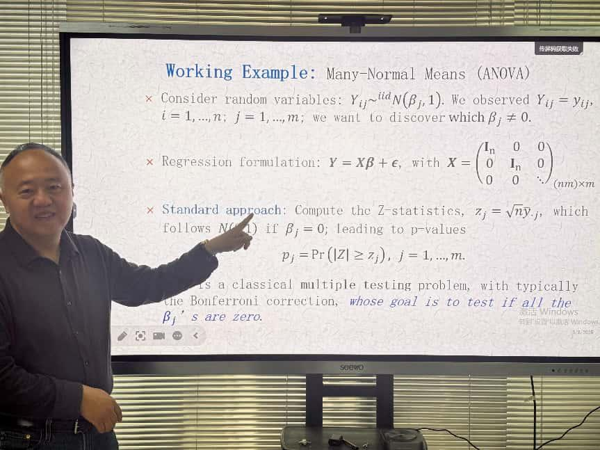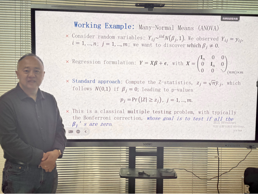 报告伊始,刘军教授从现代统计假设检验的视角切入,对p值问题的背景,渊源和优缺点进行了深刻的阐述,进一步讨论了多重检验等场景下,p值自由方法的好处,该方法十分具有启发性,引发了老师学生的极大关注。