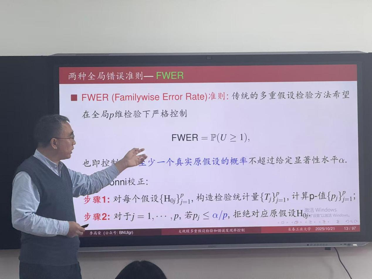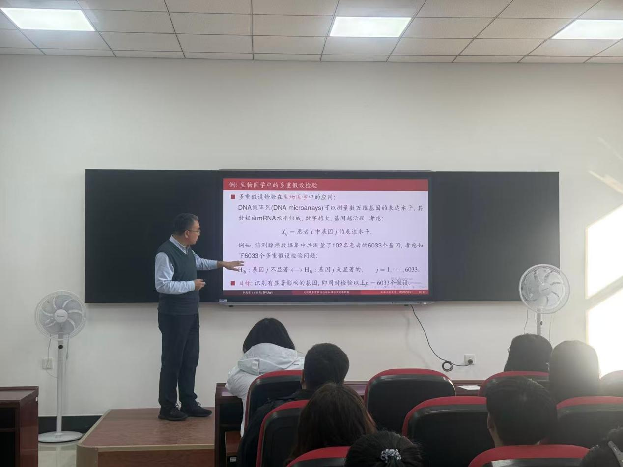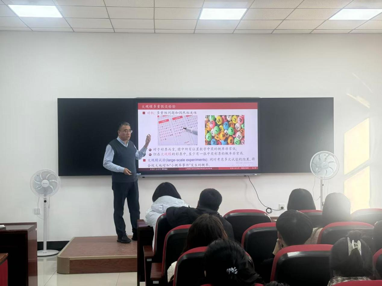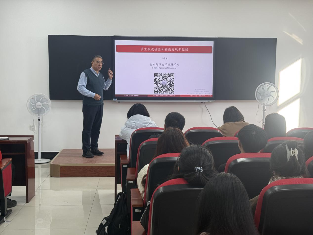 (通讯员:刘文姝)2025年10月21日下午13:30,北京师范大学李高荣教授莅临MILE米乐官方网站,针对大规模多重假设检验和错误发现率控制的问题,开展了一场专业且富有启发性的学术报告。本次报告由MILE米乐官方网站承办,在北湖东校区数统新楼216室进行,会议由MILE米乐官方网站副院长杨凯教授主持,学院部分老师及研究生参加了本次学术报告会。