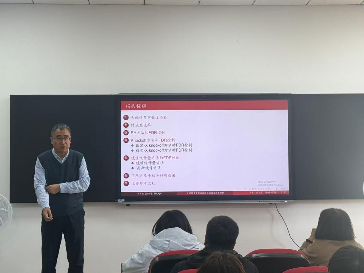 在报告的最后环节,李高荣教授梳理了该领域的未来研究方向,包括高维非线性模型的FDR控制、复杂相关结构下的方法鲁棒性优化等,并分享了团队在《Journal of the American Statistical Association》《The Annals of Statistics》等期刊发表的相关成果,以及编写《统计学习(R语言版)》等教材的经验,为在场师生提供了理论学习与实践应用的双重指引。