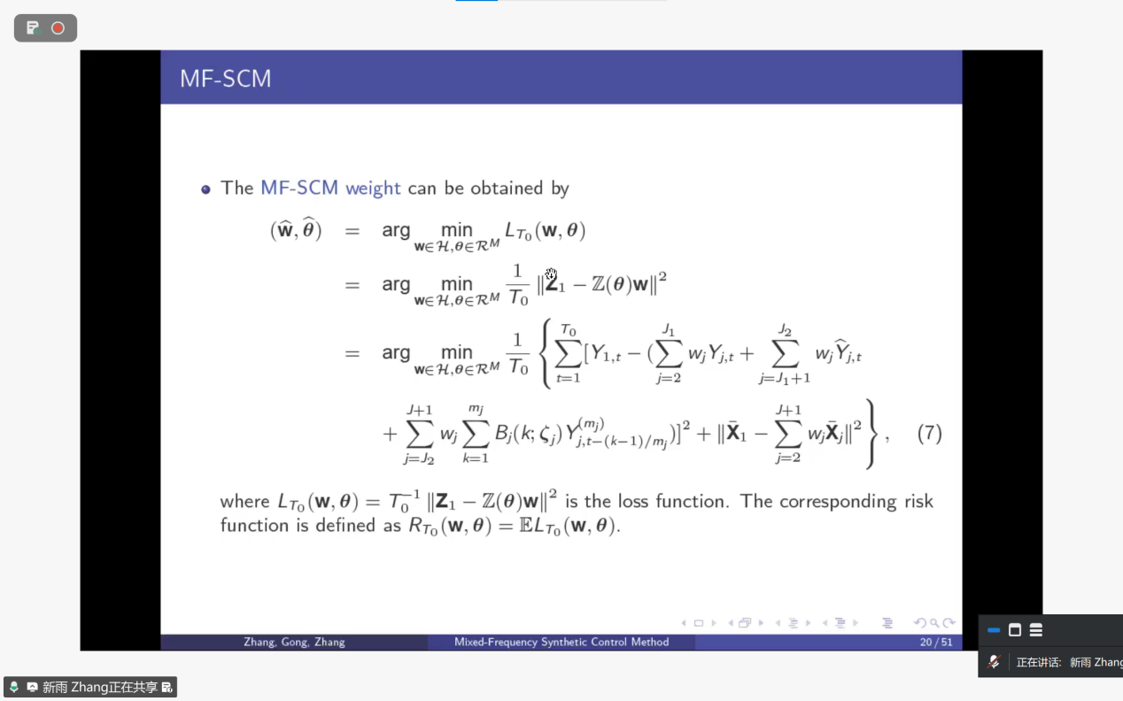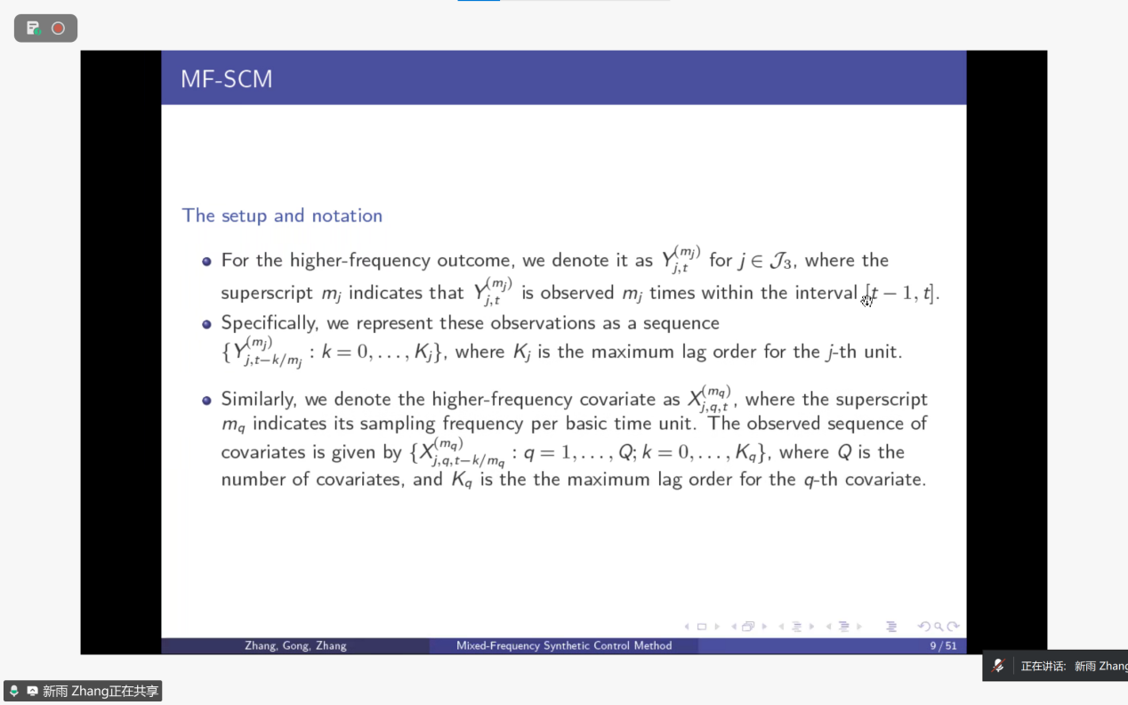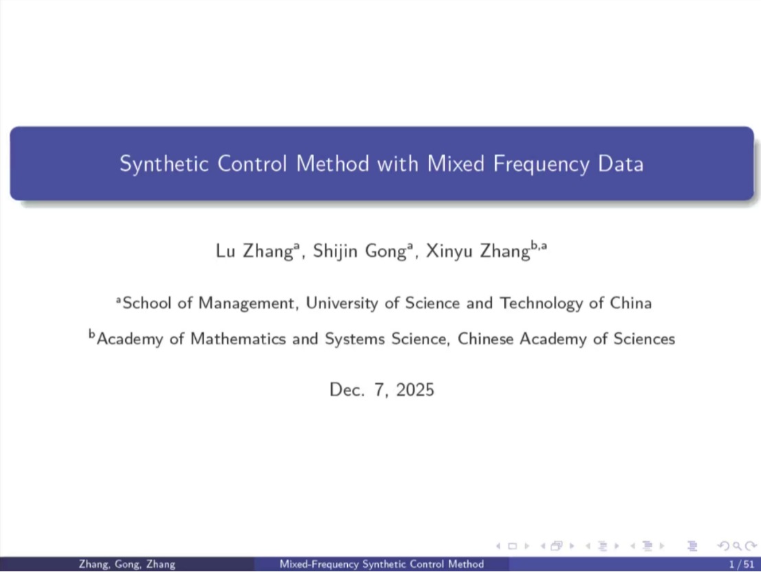 报告伊始,张教授介绍了传统合成控制法(SC)在政策因果效应评估中的基础作用,同时指出其在混合频率数据(如季度与月度数据并存)场景下的局限性——以2017年美国税改等案例为例,传统方法因数据频率不匹配易失效。张教授及团队提出的MF-SCM方法,通过分布滞后模型、潜变量框架等技术对齐不同频率数据(如将低频结果视为高频潜变量的加权聚合),再通过最优权重组合控制单元,构建处理组的反事实结果以估算政策效应。该方法还包含渐近最优性、分布理论等理论支撑,以及模拟与真实数据验证环节,为混合频率场景下的政策评估提供了新的分析工具。