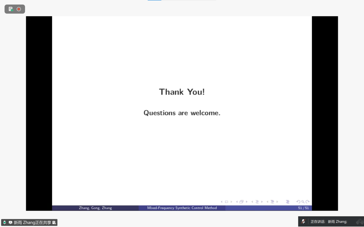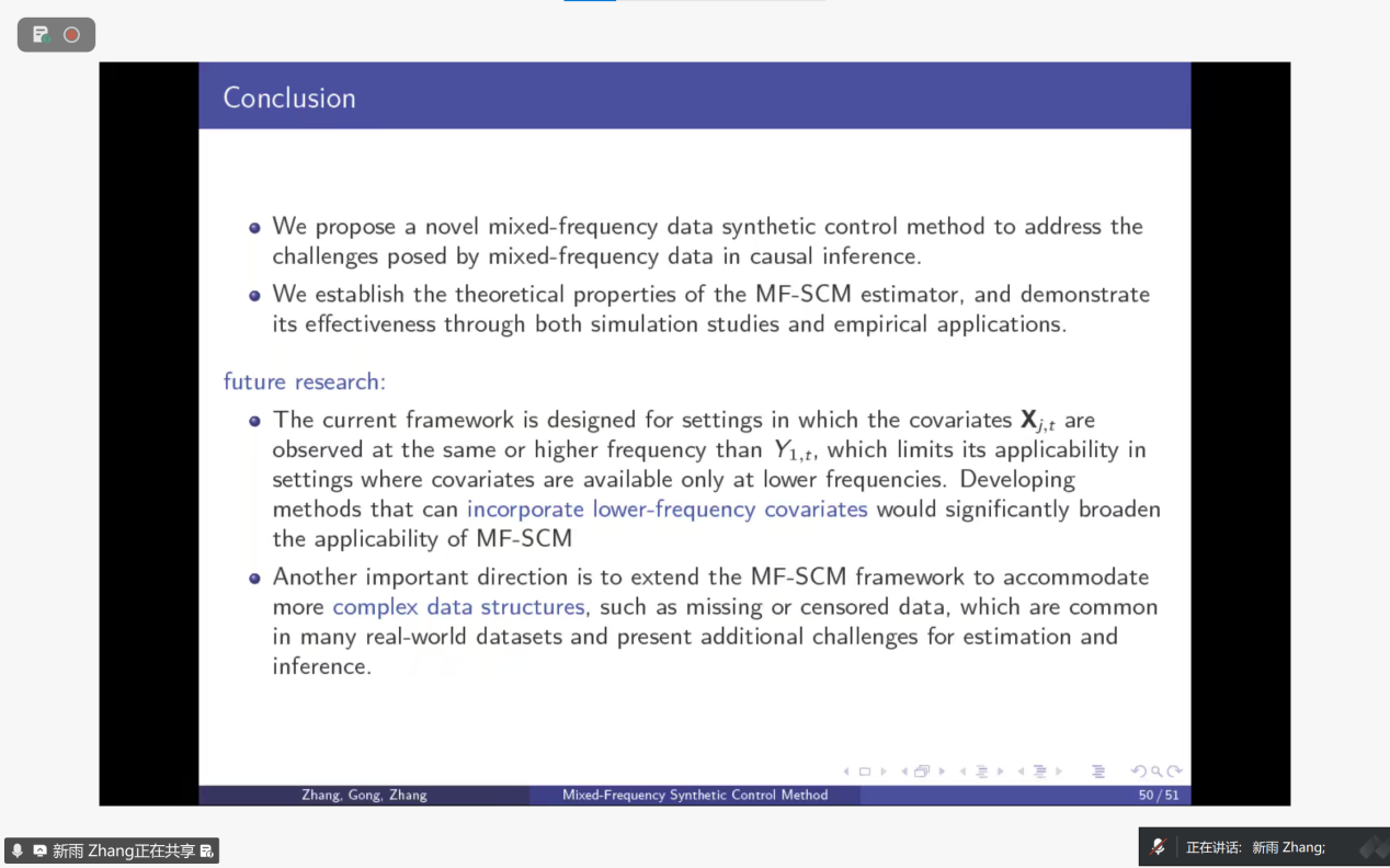 在报告的最后环节,张教授也指出了当前方法的局限性与未来研究方向:其一,现有框架仅适用于协变量频率不低于结果变量的场景,若协变量为低频数据则难以适配,后续需开发兼容低频协变量的技术,以拓宽方法的适用范围;其二,现实数据常存在缺失、删失等复杂结构,未来需拓展MF-SCM框架以适配这类数据,解决更贴近实际的估计与推断难题。这部分内容既总结了研究的核心价值,也为该领域的后续探索明确了关键方向,体现了学术研究的延续性与拓展性。