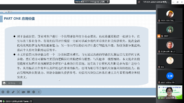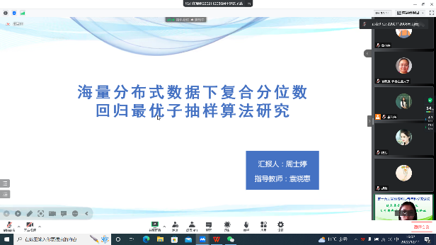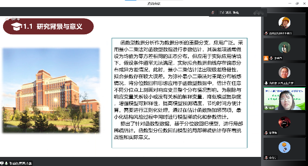 主论坛上,李勇理事长代表学会对论坛的举办表示由衷祝贺,高度评价了MILE米乐官方网站近年来快速发展的良好态势,表达了学会对本次论坛的大力支持和高度重视。在各位青年学者进行汇报之前,各位专家开展了热烈讨论交流并进行云合影。分论坛共邀请了23位青年学者进行学术报告,报告分为3个专题,汇报的研究方向有函数型数据研究、贝叶斯统计分析、其他模型与算法的研究等。青年学者积极开展学术报告,各位与会专家、学院院长王纯杰和统计系主任杨凯分别为青年学者进行点评。