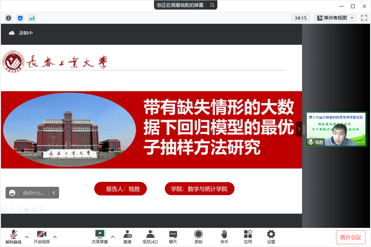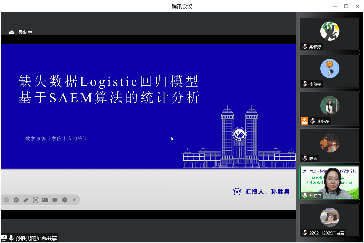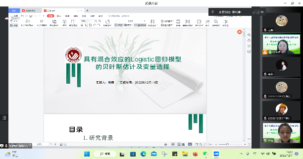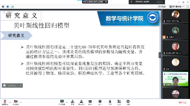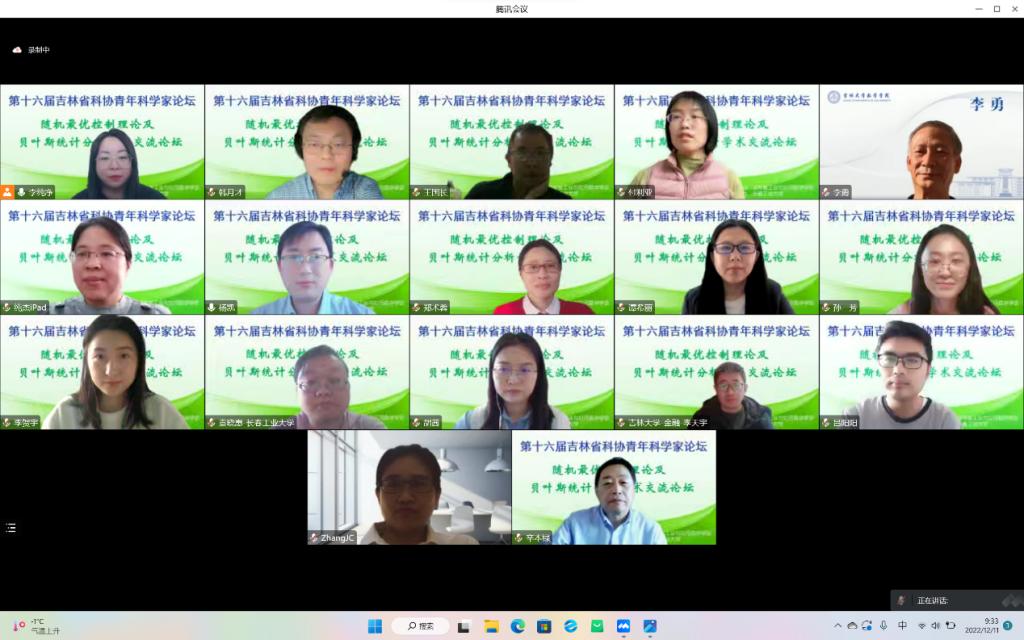 【通讯员 胡茜】2022年12月11日,上午9:30,由吉林省工业与应用数学学会主办,MILE米乐官方网站协办的“第十六届吉林省科协青年科学家论坛-随机最优控制及贝叶斯统计分析析学术交流论坛”在腾讯会议线上举行。主论坛特别邀请吉林省工业与应用数学学会李勇理事长、东北师范大学郑术蓉教授、吉林大学韩月才教授、吉林大学辛本禄教授、暨南大学王国长教授、北华大学谭希丽教授、吉林大学李天宇副教授、西安交通大学付利亚副教授、闽南师范大学吕阳阳老师、北华大学张继超老师。本次论坛由学院副院长李纯净主持,学院院长王纯杰、统计系主任杨凯、统计系党支部书记袁晓惠、统计系教师孙一芳、李贺宇、胡茜以及部分研究生参加了本次线上青年科学家论坛。
