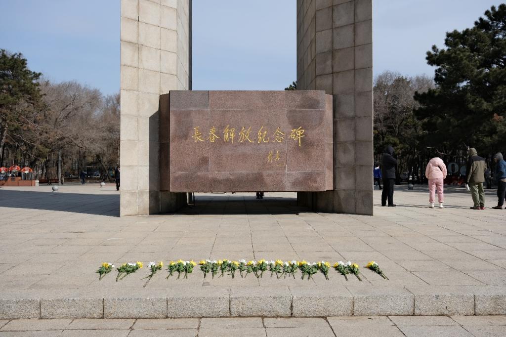 在庄严的长春解放纪念碑前,大家整齐列队,手持菊花,向在争取民族独立和解放过程中献出生命的英烈表达深切哀思和崇高敬意。