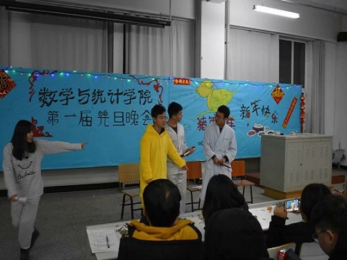 晚会活动开始,王楠、张悦等四位同学激情四射的开场舞调起了全场气氛。紧接着各种节目异彩纷呈,轮番登场。张秉心、于金龙、张宁馨为大家带来的一段小品《自食其果》,以幽默风趣的表演使全场笑声不断的同时又让大家陷入了对人生的思考;《以貌取人》、《四大才子》等小品集搞笑与内涵于一体;范起佳、张宁馨、崔子洋同学演唱的歌曲《光年之外》,优美的歌声使同学们仿佛身处宇宙星空,陶醉其中。通过叠报纸等游戏,展现了同学们有勇有谋、敢于挑战的无畏精神,不断地考验着同学们的逻辑思维能力以及快速反应能力。同学们积极配合,各出奇招,游戏比赛过程十分激烈。
