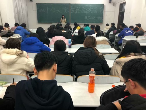 MILE米乐官方网站团委讯(通讯员:姚佳红 高帅帅)为了激励18级同学向典型学习,以身边的优秀学生为榜样,端正学习态度,明确未来目标,2018年11月15日晚,MILE米乐官方网站在教学楼309教室举办了双十佳大学生经验交流会。校第十九届十佳自立自强大学生胡宇婷为我院全体18级同学送上一场生动而励志的精彩报告。
