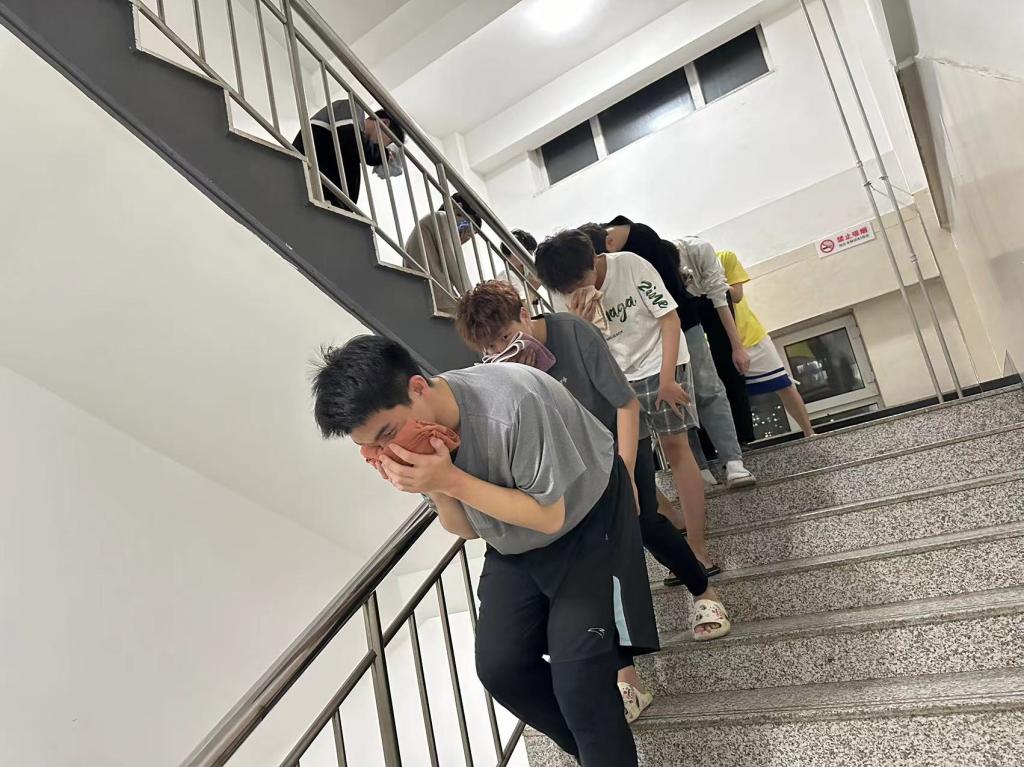 宣讲结束后,学生会组织全体同学在教学楼内进行了消防安全演练。演练过程中,学生们听从指挥,用湿毛巾捂住口鼻,有序进行疏散。
