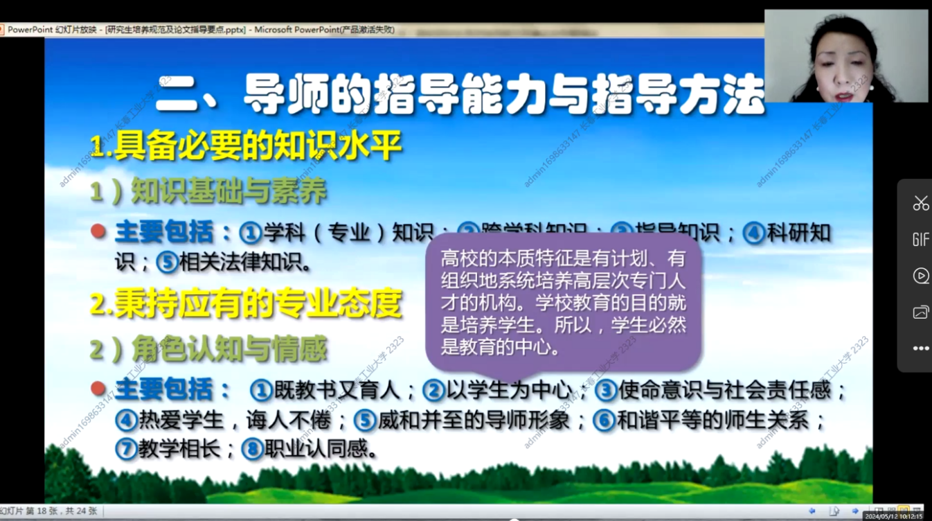 2024年5月12日上午8点30分,第一期培训班在线上如期举行,学院副院长杨凯副教授主持会议,学院全体研究生指导教师参加了本次培训。本次培训由浙江大学李丹青老师讲述研究生培养规范及论文指导要点。