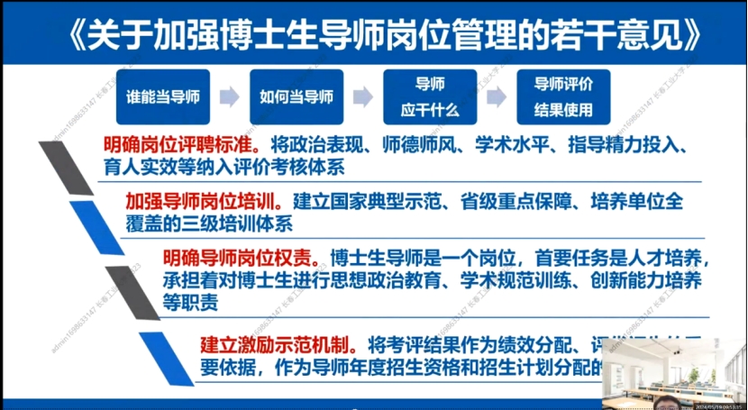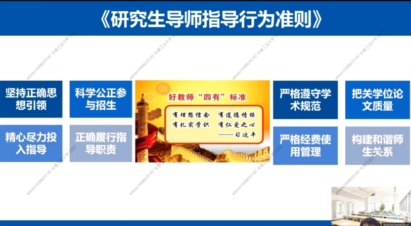 (通讯员:关迪)为贯彻落实习近平总书记关于研究生教育工作的重要指示精神,落实研究生导师立德树人根本任务,提升研究生导师教书育人能力素质,切实保障米乐官网研究生培养质量,促进学校研究生教育事业高质量发展。根据《教育部关于全面落实研究生导师立德树人职责的意见》(教研〔2018〕1号)、《MILE米乐官方网站研究生指导教师培训管理办法》(研字〔2022〕7号)等文件精神,MILE米乐官方网站于2024年5月19日上午8点30分,第二期培训班在线上如期举行,学院副院长杨凯副教授主持会议,学院全体研究生指导教师参加了本次培训。本次培训由清华大学王传毅老师讲述面向新时代的中国研究生教育改革:近三年研究生教育重大改革政策解读。