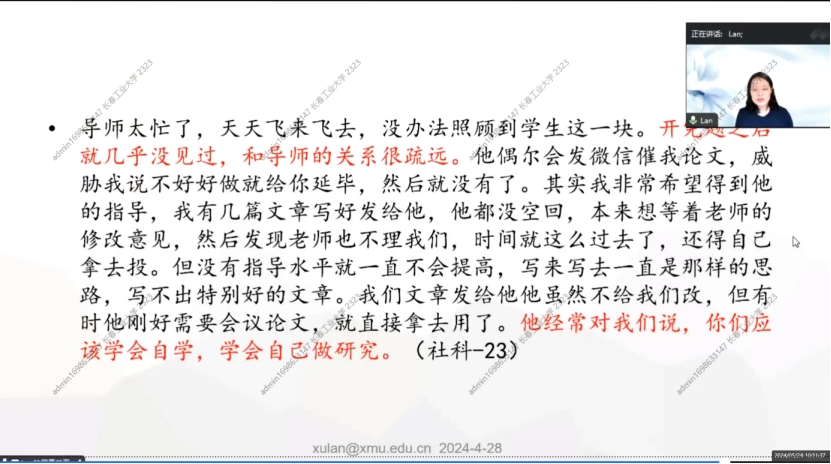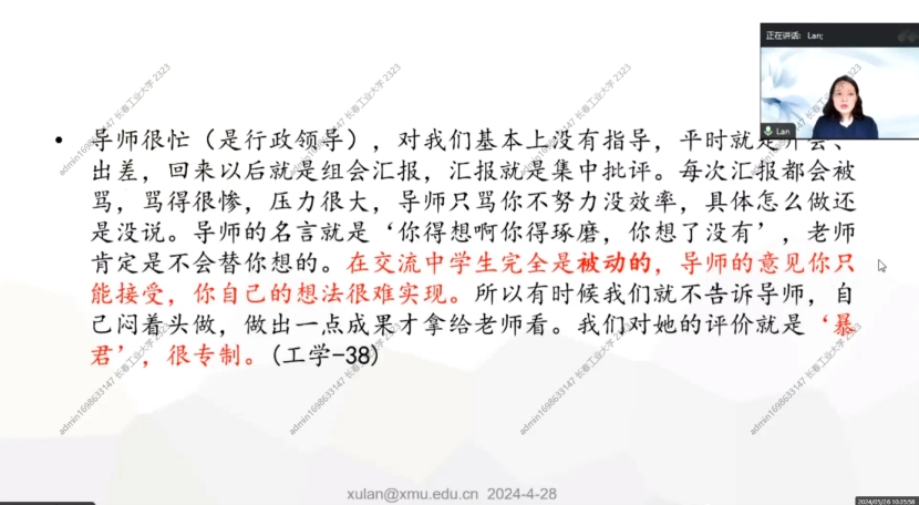 主要是因为科研评价体制导致的利益冲突。导师的任务是拉项目养实验室,角色是“科研包工头”,研究生的角色则是“为老板打工”,认为导师对其存在一定程度的“剥削”或“控制”的关系。导师控制着学生能否毕业的生杀大权,因此在导师要求学生做事的时候“不能讨价还价”,要“定位好自己的角色”。有时候学生认为导师比老板好一些,但“师生之间有着天然的差距,是注定做不了朋友的”。