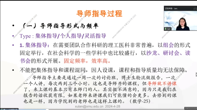 1.集体指导:在需要团队合作科研的理工医科非常普遍,以组会的形式固定举行,在社会科学的一些学科中也比较盛行,以沙龙、研讨会、读书会的形式开展。固定频率,效率高。