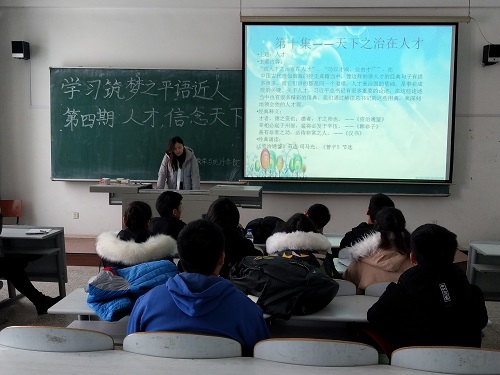 MILE米乐官方网站团委讯(通讯员:姚佳红 张宁馨)为了让同学们更好的传承中国传统文化,加强同学们对党工作的认识,培养创新型人才,MILE米乐官方网站团委于2018年12月21日在教图楼309教室开展“学习筑梦”系列活动之《平“语”近人》之“人才,信念,天下”理论学习会。学院2018级主要学团干部参加本次会议,由团委宣传部副部长兼170802班团支书宋思晗主持会议。