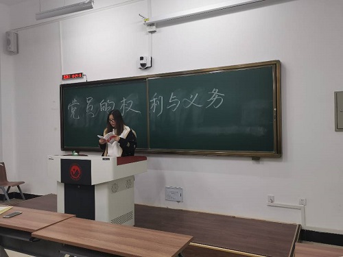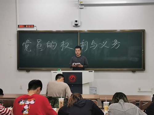 理论学习课上,宋思晗为大家介绍了党员的权利,强调要热爱和拥护党,任何党员不得以权谋私。宋思晗通过列举党员滥用权利的案例及后果,警示同学们要以身作则,并鼓励同学们要正确行使党员的权利。在大家了解党员权利后,虎佳尧向同学们讲述了作为一名合格的共产党员应该履行的义务。同时虎佳尧又讲述了马克思主义和习近平新时代中国特色社会主义思想的内涵,呼吁同学们认真学习党的路线、方针、政策及决议,学习党的基本知识,学习科学、文化和业务知识,不断强化自身素养,努力提高为人民服务的意识。